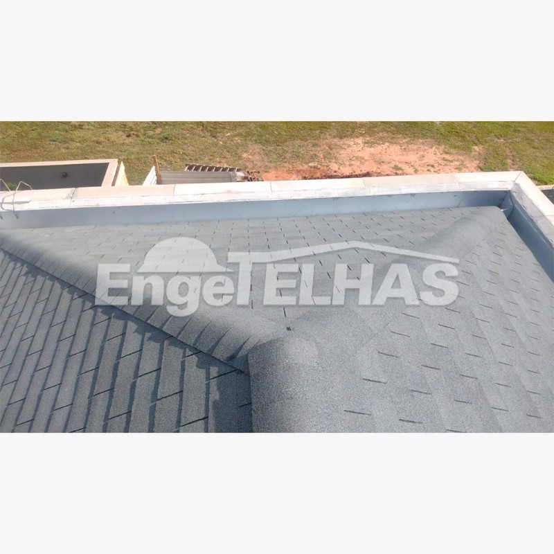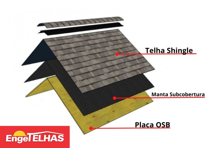 - Telha Shingle: É composta por uma base de manta asfáltica, reforçada com fibras de vidro e revestida com gravilhas minerais ou sintéticas.