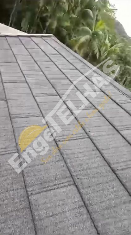 O modelo de telha selecionado para a obra é o telhado gravilhado shake na cor cinza-preta, cuja entrega ocorreu em um prazo de 25 dias após a conclusão das negociações. Mesmo com a construção ainda não estando finalizada, já dá para ter uma ideia de como vai ficar bonito.